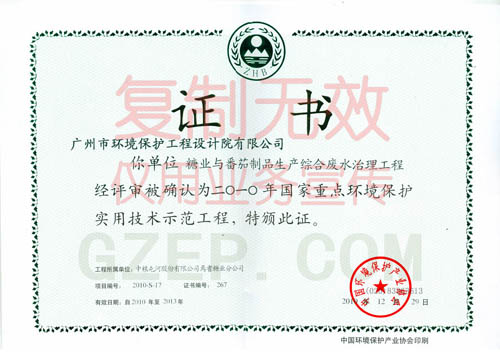 【名称】2010年国家重点环境保护实用技术示范工程(糖业与番茄制品生产综合废水治理工程) 证书号:** 证书等级:**