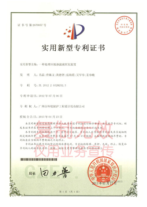【名称】实用新型专利证书(一种处理垃圾渗滤液厌氧装置) 证书号:** 证书等级:**