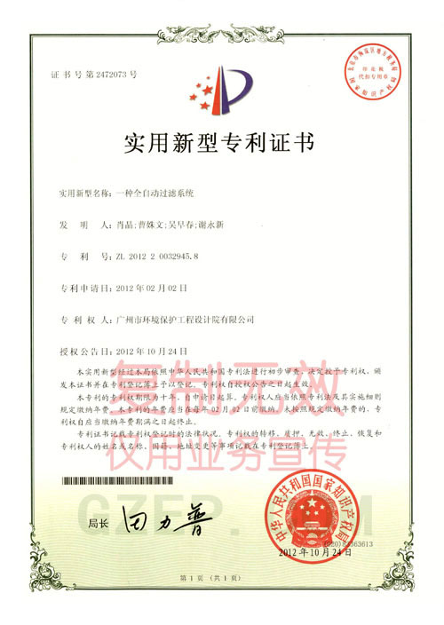 【名称】实用新型专利证书(全自动过滤系统) 证书号:** 证书等级:**