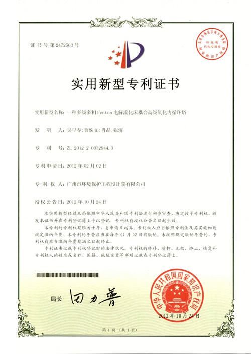 【名称】实用新型专利证书(一种多级多相FENTON电解流化床耦合高级氧化内循环塔) 证书号:** 证书等级:**