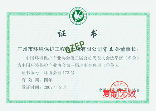 【名称】中国环境保护产业协会第三届理事会理事证书 证书号:环协会理173 证书等级:**