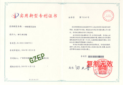 【名称】实用新型专利证书 (一种斜管沉淀池) 证书号:ZL 2004 Z00887553 证书等级:**