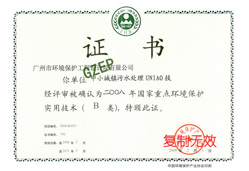 【名称】2008年国家重点环境保护实用技术(B类) (中小城镇污水处理UNIAO技术) 证书号:791 证书等级:**
