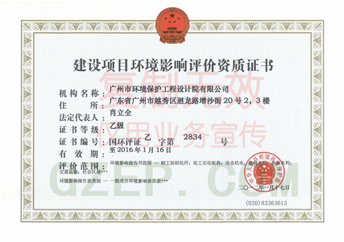 【名称】建设项目环境影响评价资质证书 证书号:国环评证乙字第2834号 证书等级:乙级