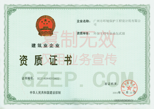 【名称】建筑业企业资质证书 (环保工程专业承包贰级) 证书号:A2104044010419 证书等级:贰级