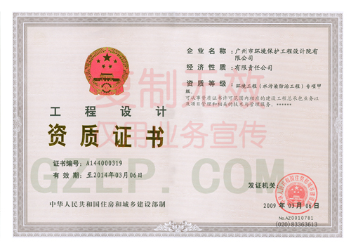 【名称】工程设计证书 (环境工程甲级) 证书号:A1440003197 证书等级:甲级
